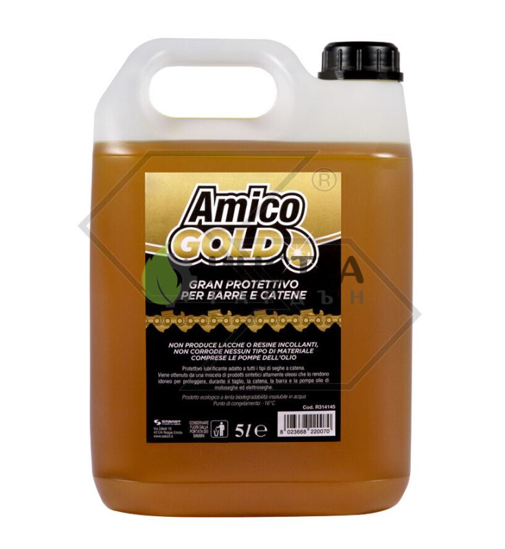 МАСЛО ЗА СМАЗВАНЕ НА ВЕРИГАТА AMICO GOLD. ОПАКОВКА ОТ 1 ЛИТЪР. СИНТЕТИЧНО ПРЕДПАЗВАЩО МАСЛО, ПОДХОДЯЩО ЗА ВСИЧКИ ВИДОВЕ ВЕРИГИ ЗА РЯЗАНЕ. СЪДЪРЖА СПЕЦИФИЧНИ СЪСТАВКИ, КОИТО ГО ПРАВЯТ ПОДХОДЯЩО ЗА ЗАЩИТА НА ВЕРИГАТА, ШИНАТА И МАСЛЕНАТА ПОМПА ПО ВРЕМЕ НА РЯЗАНЕ ПРИ МОТОРНИ И ЕЛЕКТРИЧЕСКИ ВЕРИЖНИ ТРИОНИ. НЕ ВОДИ ДО ПОЯВЯВАНЕ НА СГЪСТАЦИ ОТ ЛАК ИЛИ ЛЕПИЛО. НЕ ВОДИ ДО КОРОЗИЯ НА МАТЕРИАЛИТЕ, ВКЛЮЧИТЕЛНО И ЗА МАСЛЕНАТА ПОМПА. НЕ СЕ РАЗТВАРЯ ВЪВ ВОДА. ЕКОЛОГИЧЕН ПРОДУКТ, КОЙТО СЕ РАЗГРАЖДА БАВНО В ПРИРОДАТА. ТЕМПЕРАТУРА НА ЗАМРЪЗВАНЕ: -16. КИСЕЛИННОСТ: МНОГО НИСКА.