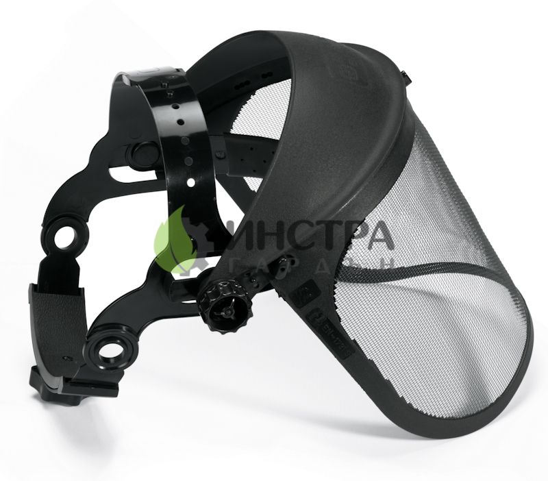 Предпазен шлем с мрежест визьор, предпазва лицето при рязане на дърва или косене, като същевременно не запарва,